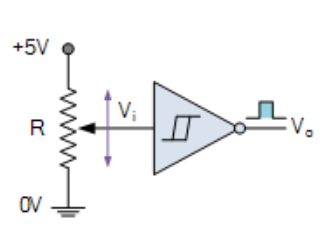 同样,如果电位器滑片位于+5V并向0V降低,会有一个点,Vi的电压等于或低于较低阈值输入或较低触发点(VLTP),导致施密特反相器再次改变状态。