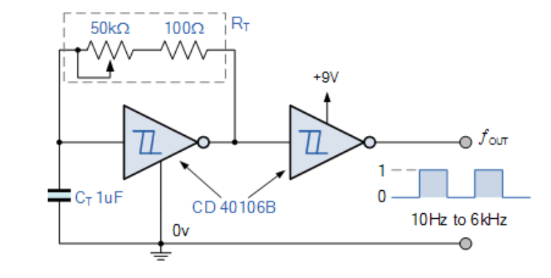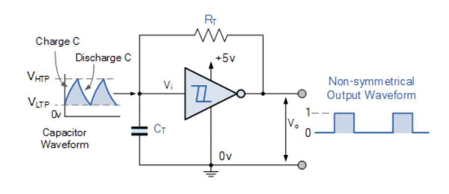当放电电容器板上的电压达到施密特触发器的较低阈值时,它会导致其改变状态,整个过程重复。