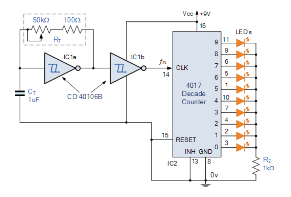 但除了驱动所有十个LED外,4017B约翰逊计数器还可以配置为具有“N”个解码输出的计数器,其中“N”可以是2到9之间的任何数字。