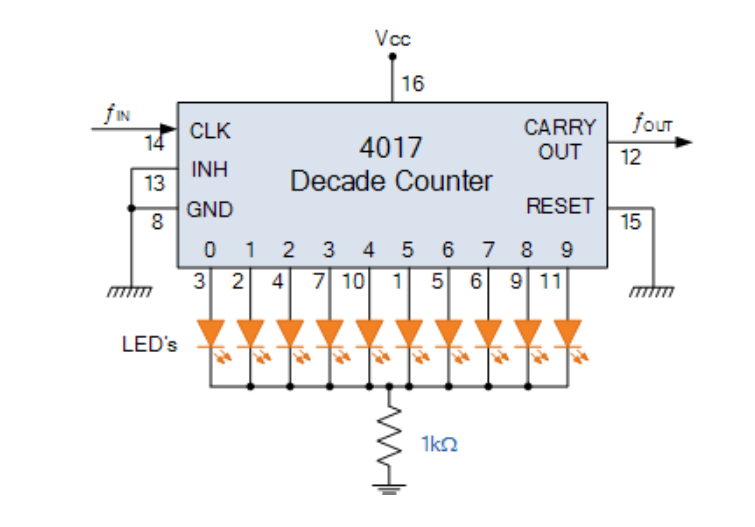 4017B十进制计数器有十个完全解码的输出,每个输出能够切换高达20mA。每个解码的输出通常为低电平(逻辑“0”),并依次切换为高电平(逻辑“1”)。这里的优点是我们可以使用每个输出来直接驱动单个LED,更好的是,由于任何时候只有一个LED点亮,所有10个LED只需要一个限流电阻,如图所示。