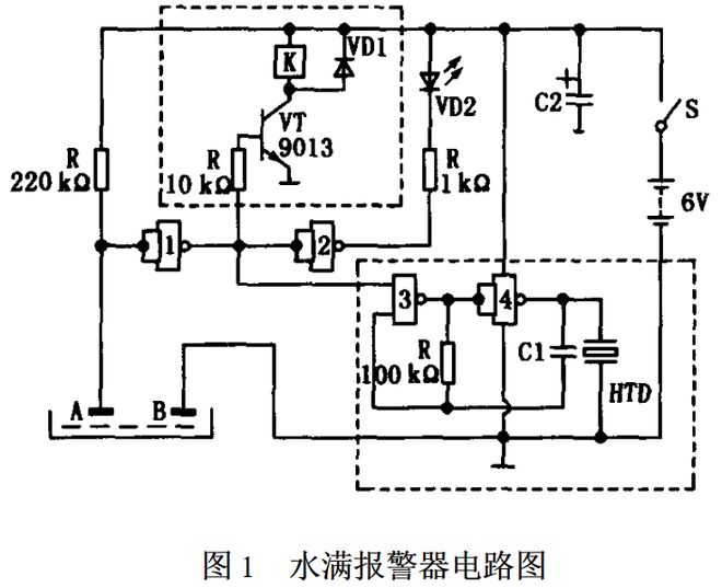 图 1 中水满报警器电路原理图只是一个示例 ,发人员还可以根据自身需要设计更简捷的电路。图 1 中与非门 1 承担了水满电阻变小后的高低电位转换的信号探测功能 ,三极管 V T、与非门 2 和与非门 3 ,4 则分别承担了切断风机电源 、发光报警和声音报警三项后续功能 ,这三项功能完全可以根据用户的实际需求进行改变 ,甚至还可以将报警指示信号添加在目前的风机盘管控制面板上 。