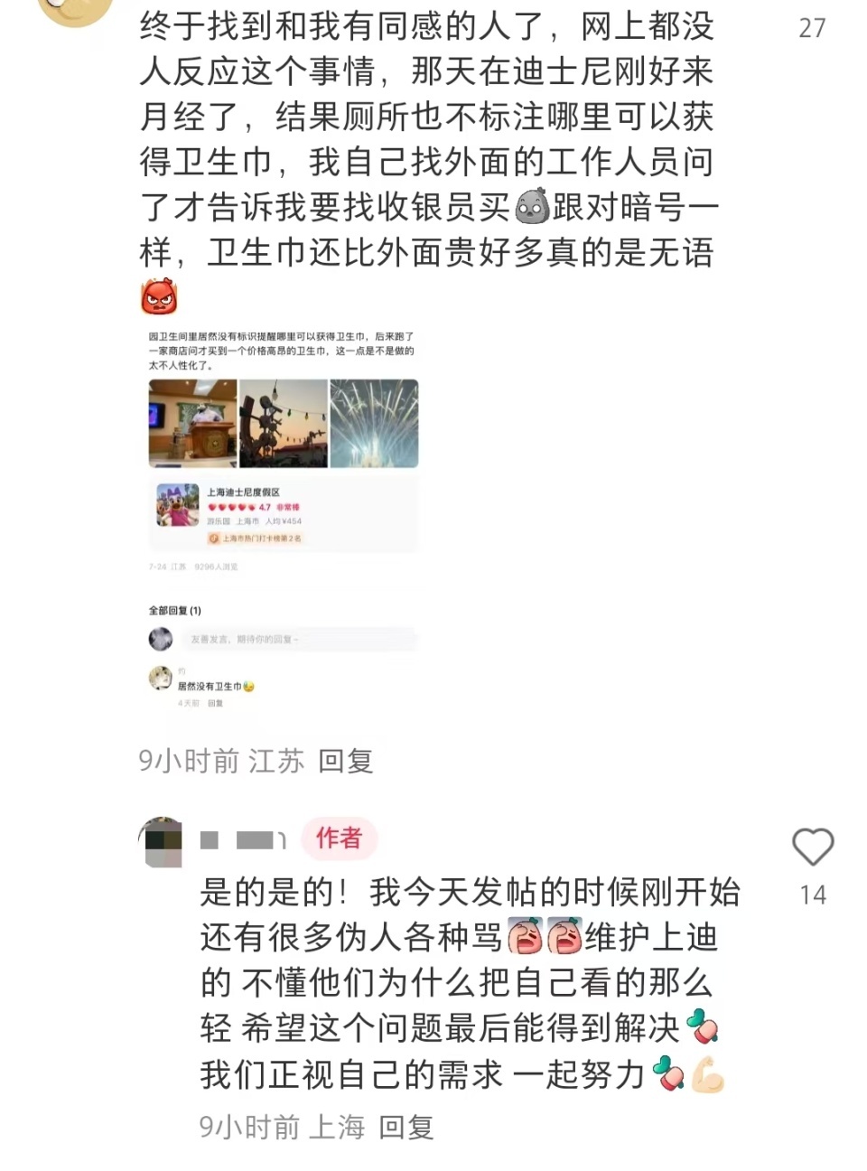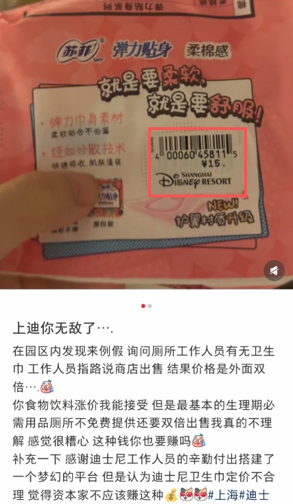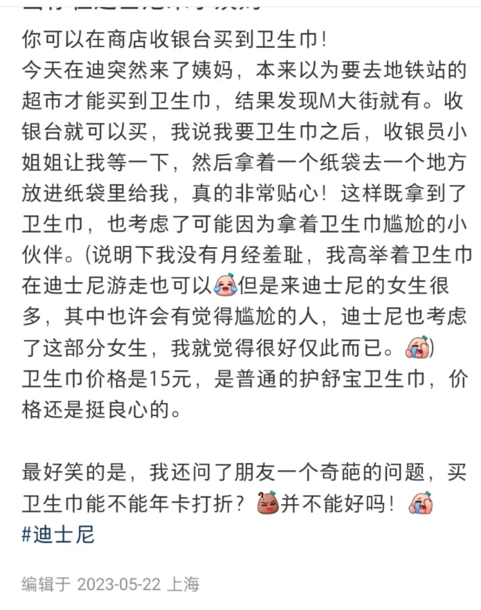 搜索相关信息发现,2023年曾有网友发帖称可以在迪士尼购买到卫生巾,价格为15元,认为此举对女性友好,并且价格良心。