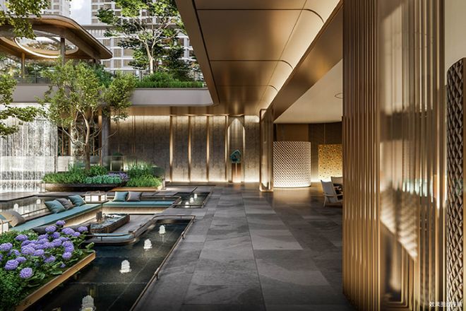 内里的会所,搭配了瑜伽室、健身房、会客厅、影音室等多重功能空间。植被的铺设,下沉式庭院的设计搭配15.5米高的米泉玻璃墙,兼顾景致和采光,看得出设计的巧思。