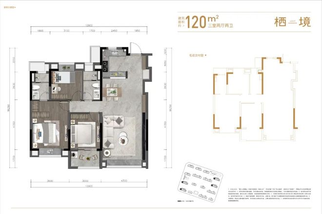 先来看其中面积居中的120m²户型,三室两厅两位的布局,动静分区。西边次卧带阳台,增加了次卧空间,主卧与另一个次卧带飘窗,主卧带独卫,且客厅阳台一体化,采光良好,两卫都是明卫,通风好。