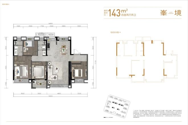 143m²户型,四室两厅两卫布局,客厅阳台一体化,同样在西边的次卧配了一个大阳台,增加了次卧的空间感和私密性。除该房间外其余卧室均配飘窗,该户型房型方正,舒适度高,四个卧室也可满足多人居住要求。