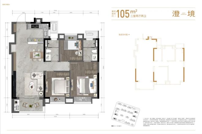 较小的105m²户型,不是很大但功能齐全:双明卫设计,通风采光俱佳;客厅外接大阳台,打造理想休闲空间,尽享阳光与茶韵。空间布局上,同样动静分区。户型基本满足现代生活的多元需求。