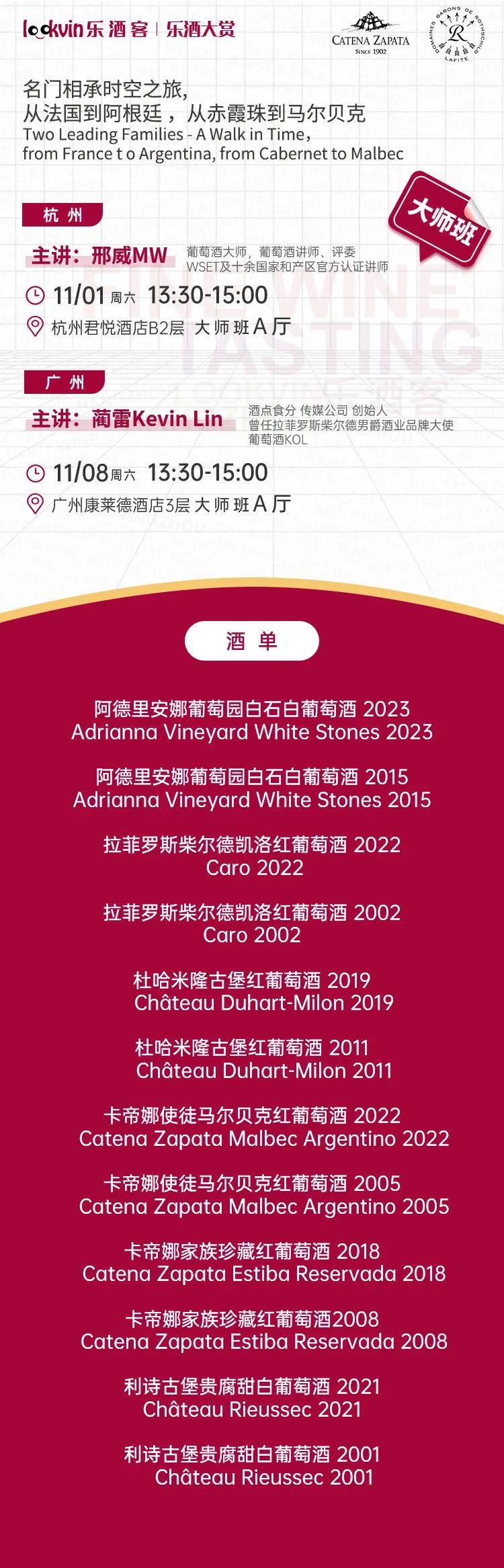 这场主题大师班在杭州和广州的主题与酒款一致,杭州是近来炙手可热的葡萄酒大师邢威MW主讲,听过邢威老师讲课的都知道,没有人能逃脱他的渊博和风趣。广州的讲师更是最近在各视频平台粉丝狂涨的“酒点食分 创始人”蔺雷Kevin,曾任拉菲罗斯柴尔德酒业品牌大使的他这次会给大家带来哪些新的故事。