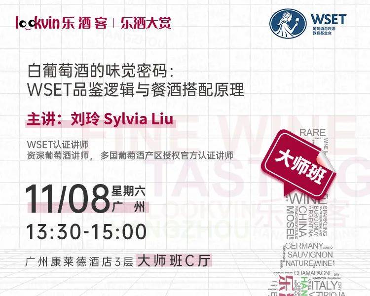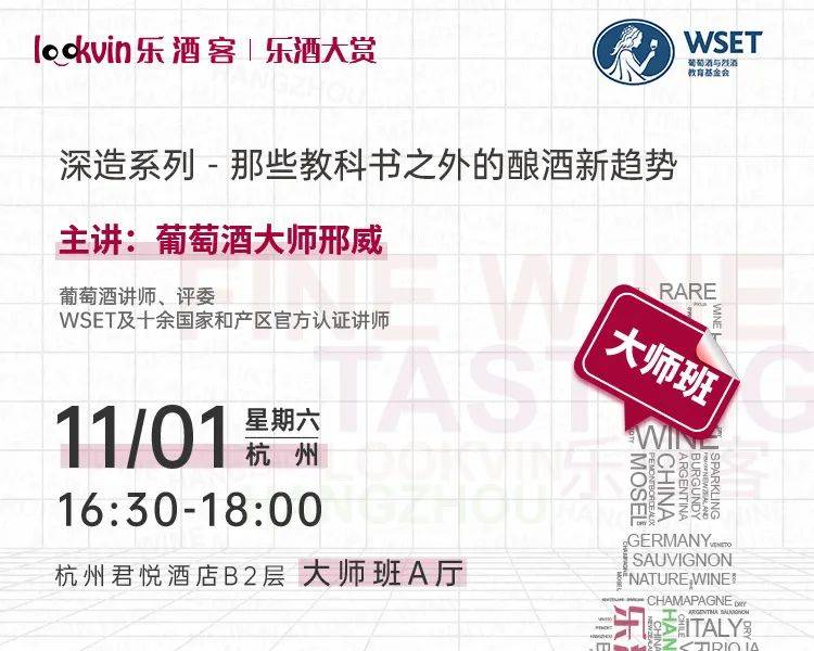 除了以上开售的大师班外,我们还与WSET(葡萄酒与烈酒教育基金会 Wine & Spirit Education Trust)共同筹备了杭州站“深造系列 - 那些教科书之外的酿酒新趋势”大师班,由葡萄酒大师邢威MW主讲、广州站“白葡萄酒的味觉密码:WSET品鉴逻辑与餐酒搭配原理”,由获得WSET第四级葡萄酒文凭认证的刘玲Sylvia主讲。